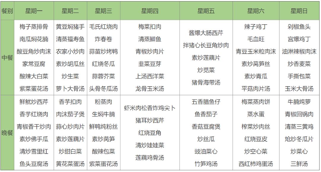 十二元菜谱(中、晚餐各6元/人/餐,一荤两素,菜量足够,米饭例汤任吃,每周不同,每天十二元)