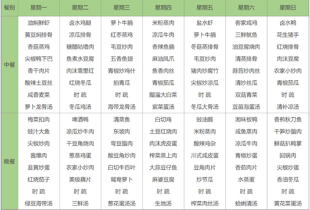 十四元菜谱 (中、晚餐各7元/人/餐,两荤一素,菜量足够,米饭例汤任吃,每周不同,每天十四元)